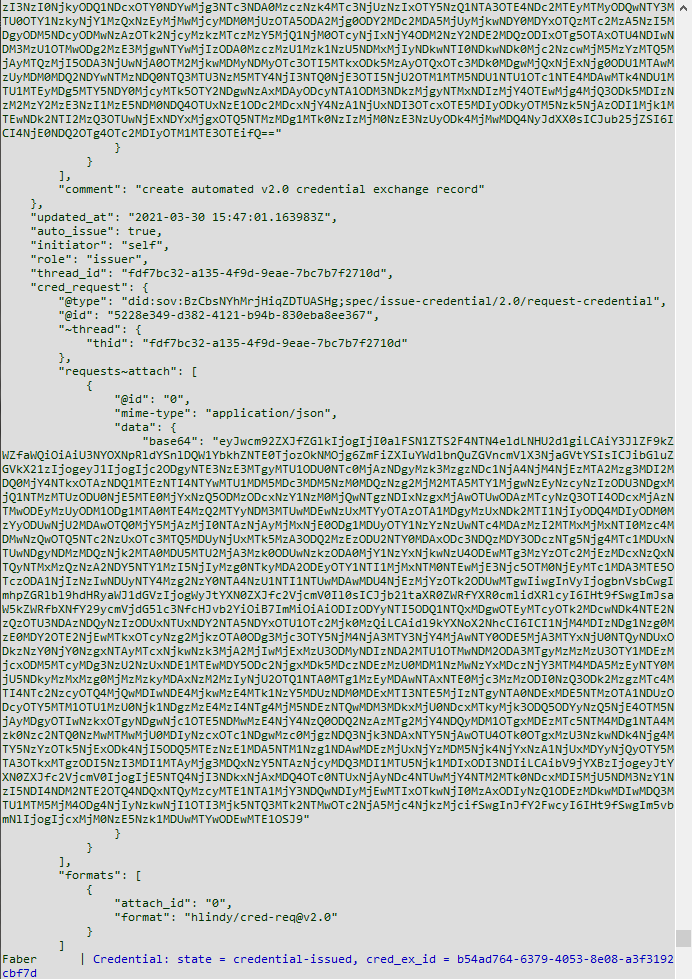 On the Faber side, we can see by scanning back in the terminal that it receive events to notify that the credential was issued and accepted.
