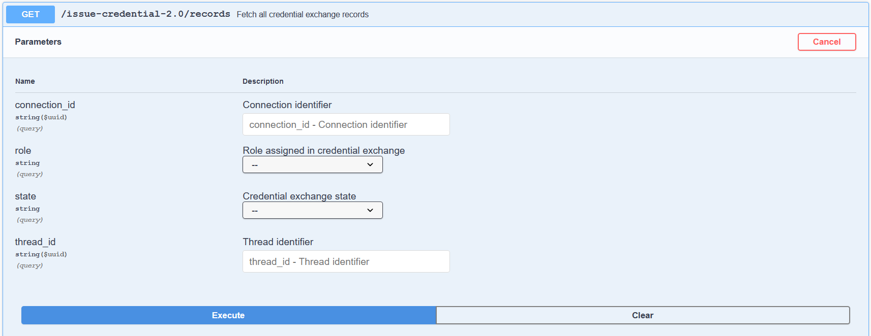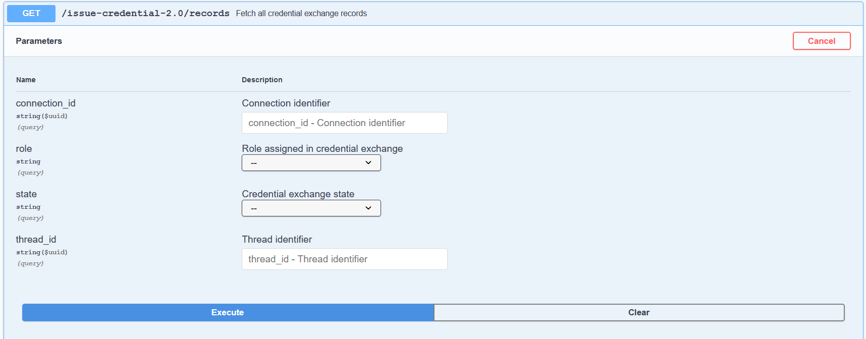 To confirm the issuance worked, scroll up on the Faber Swagger page to the issue-credential v2.0 section and execute the GET /issue-credential-2.0/records endpoint. You should see a lot of information about the exchange just initiated.