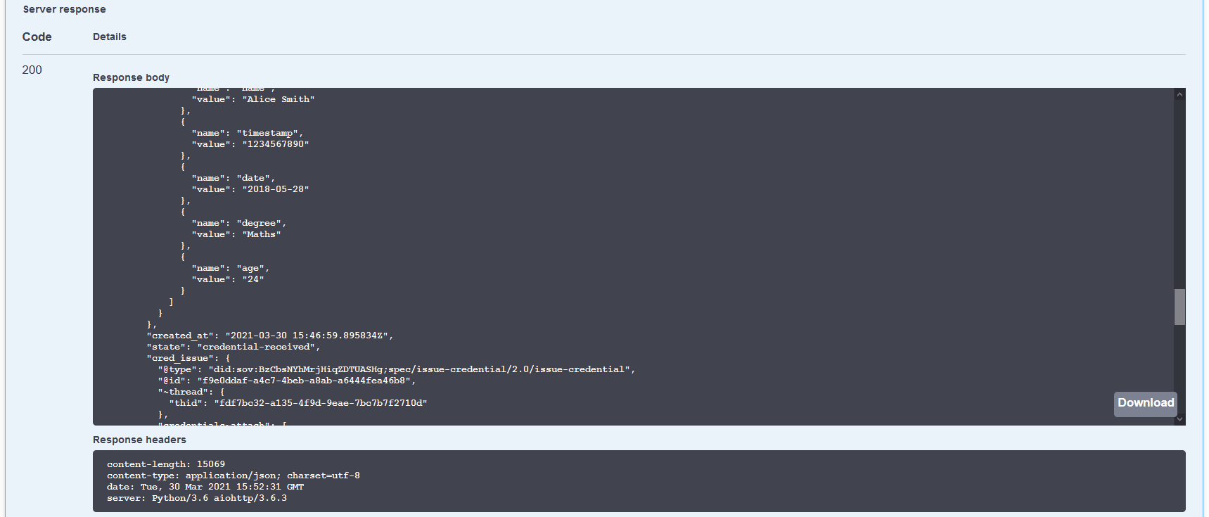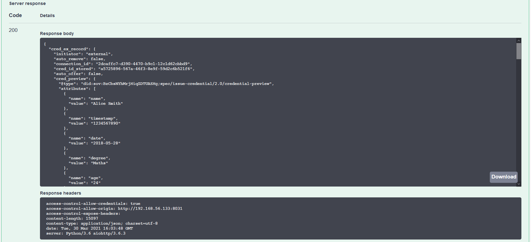 Now, in Alice’s swagger browser tab, find the credentials section and within that, execute the GET /credentials endpoint. There should be a list of credentials held by Alice, with just a single entry, the credential issued from the Faber agent. Note that the element referent is the value of the credential_id element used in other calls. referent is the name returned in the indy-sdk call to get the set of credentials for the wallet and ACA-Py code does not change it in the response.