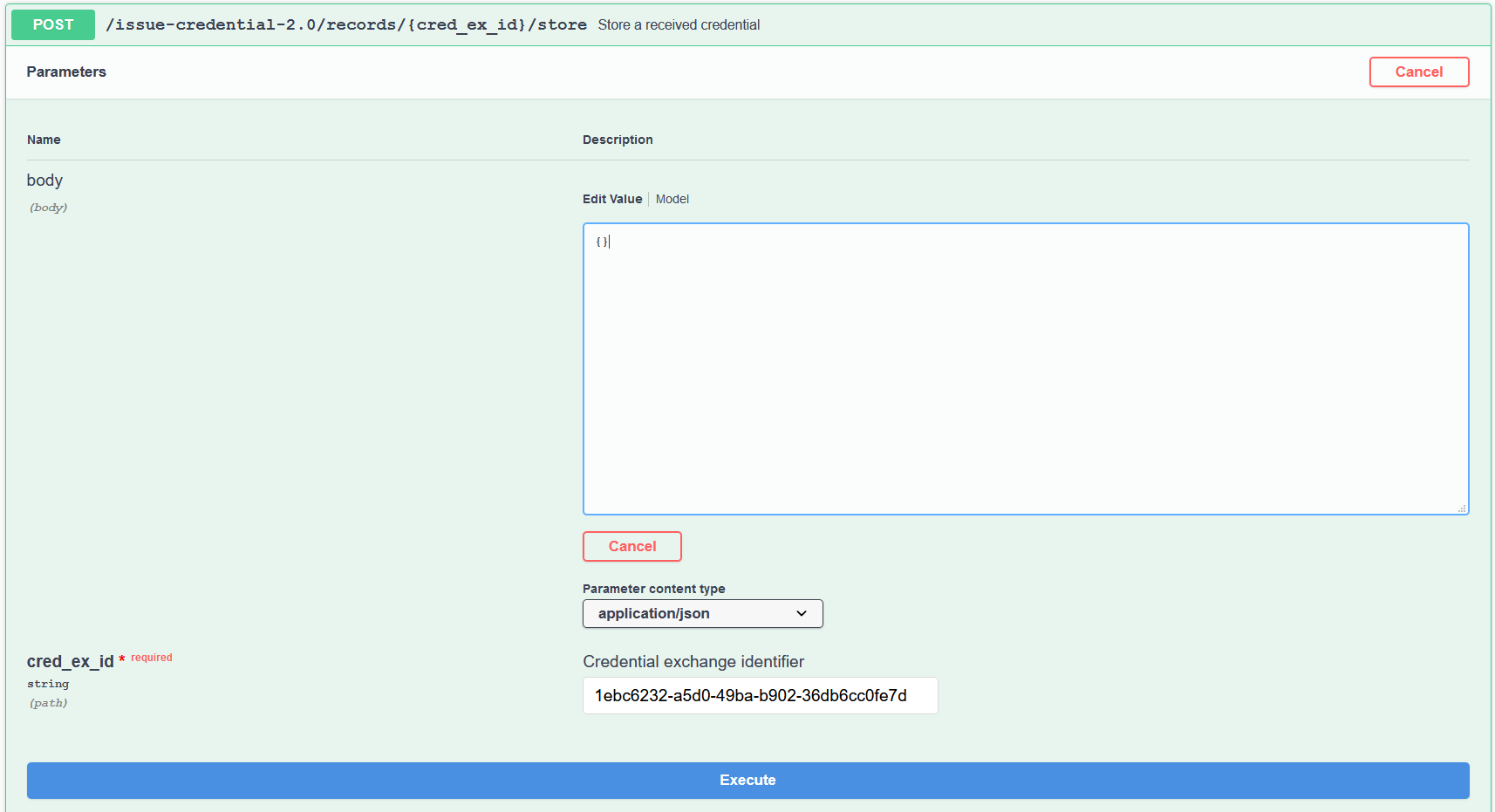 First, we need the cred_ex_id from the API call response above, or from the event in the terminal; use the endpoint POST /issue-credential-2.0/records/{cred_ex_id}/store to tell Alice's ACA-Py instance to store the credential in agent storage (aka the Indy Wallet). Note that in the JSON for that endpoint we can provide a credential Id to store in the wallet by setting a value in the credential_id string. A real controller might use the cred_ex_id for that, or use something else that makes sense in the agent's business scenario (but the agent generates a random credential identifier by default).