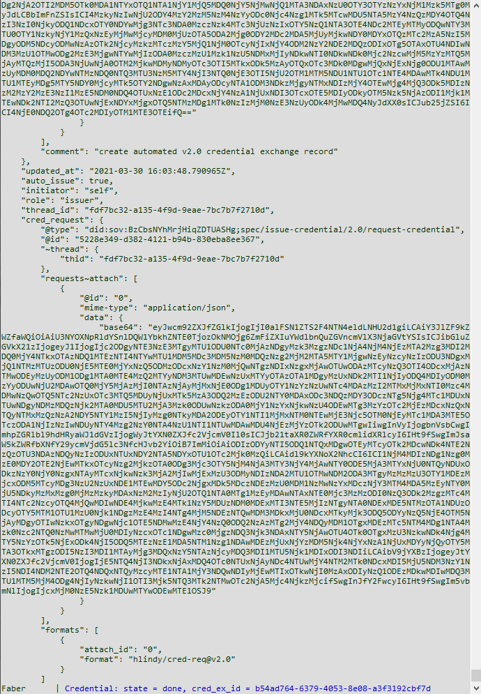 • On the Faber agent side, this is because we used the POST /issue-credential-2.0/send administrative message, which handles the back and forth for the issuer automatically. We could have used the other /issue-credential-2.0/ endpoints to allow the controller to handle each step of the protocol.
